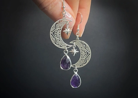 - Kolczyki luna z ametystem i srebrem 925 – harmonia, intuicja i duchowy rozwój. Czakra trzeciego oka, korony, kobieca energia.