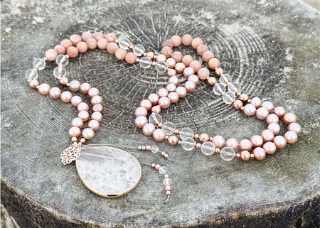 • Długa mala 108 kamieni z pereł i kamienia słonecznego z elementami pozłacanymi różowym złotem. Ręcznie wykonany naszyjnik boho, który wspiera kobiecą energię.