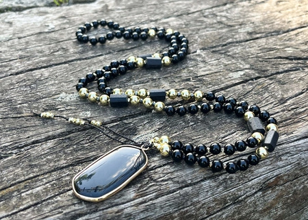 Naszyjnik mala z 108 naturalnych kamieni: onyksu, czarnego turmalinu i złotego hematytu to połączenie siły, uziemienia i wewnętrznej stabilności. Każdy kamień został ręcznie nawleczony na mocny czarny nylonowy sznurek i supełkowany w tradycyjny sposób. Zwieńczeniem mali jest zawieszka z czarnego onyksu. Eleganckie akcenty hematytu sprawiają, że mala ta doskonale łączy funkcję duchową z estetyką boho.