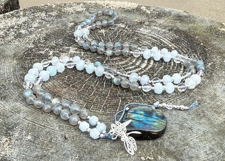 Długa mala 108 kamieni z labradorytu i akwamarynu – intuicja, spokój i komunikacja