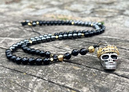 - Męski naszyjnik różaniec z onyksu i hematytu z pozłacanymi elementami 925, zakończony czaszką z koroną. Podkreśla siłę i niezależność, dodaje stylu każdej stylizacji.